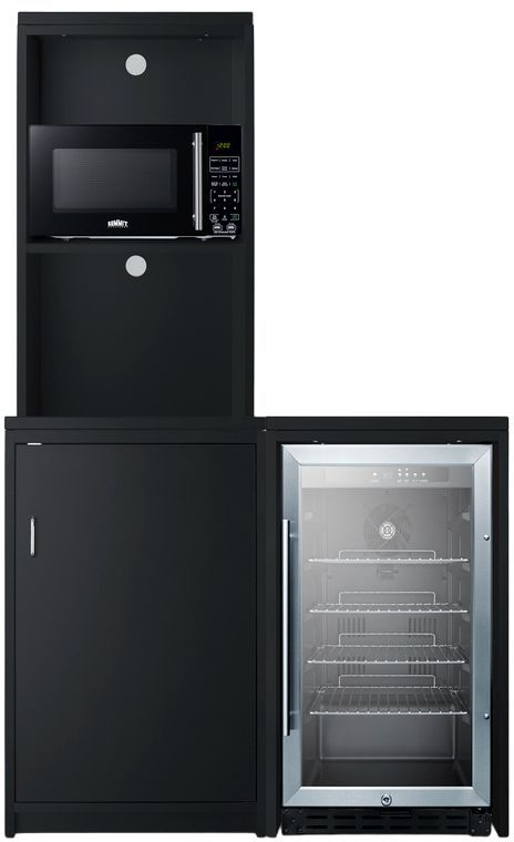 Each cabinet piece is manufactured in the USA from engineered wood in a jet black laminate finish. The trash cabinet includes two bins and two counter holes to allow easy separation of rubbish and recycling. The hutch features two holes to allow you to easily run power cords through, accommodating the microwave as well as other small appliances, such as coffeemakers or toasters. The SM903BSA microwave features a built-in outlet to accept a 2 or 3-prong cord, allowing easy 1-plug operation that will temporarily shut off the other second device while the microwave is in use to prevent power surges. It also comes with two USB ports to charge mobile devices. Beverage refrigerator SCR1841BADA offers a full 2.7 cu.ft. of storage capacity, with reversible glass door, no-frost operation, digital temperature control, and LED lighting.
